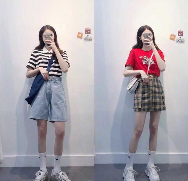 想要T恤穿得颜高身材棒的效果,我们可以参考这组look。首先选择不挑肤色的基础色T恤,上身显白又容易显得普通。而搭配一件大长腿速成的A字短裙,上身就能展现出春日女孩独特的气质与魅力。
