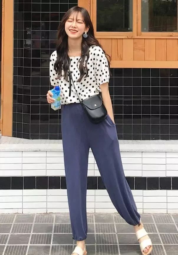 阔腿裤已经跟不上潮流了,现在比较流行小姐姐穿的这种蓝色的薄长裤。裤子看起来很宽松,虽然有紧裤脚的设计,但是裤管部分是非常休闲宽松的,穿上就很舒适的感觉,甚至有点像睡裤!